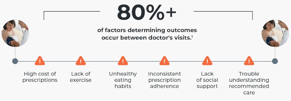 It’s estimated that 80% of health outcomes are influenced by factors occurring between doctor visits, which is exactly where Omada focuses.
