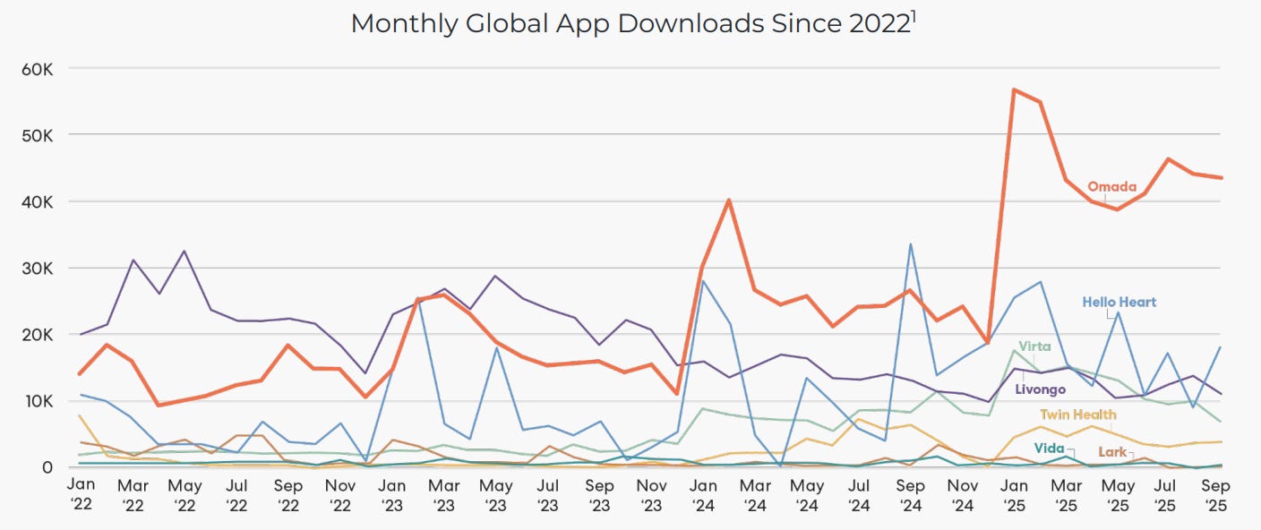 Omada operates in a differentiated B2B2C model - employers and health plans pay for access (members don’t pay directly), creating stickier enterprise relationships and higher barriers for D2C competitors.